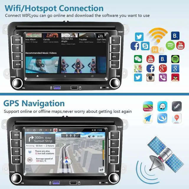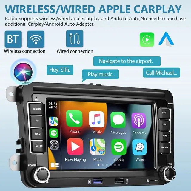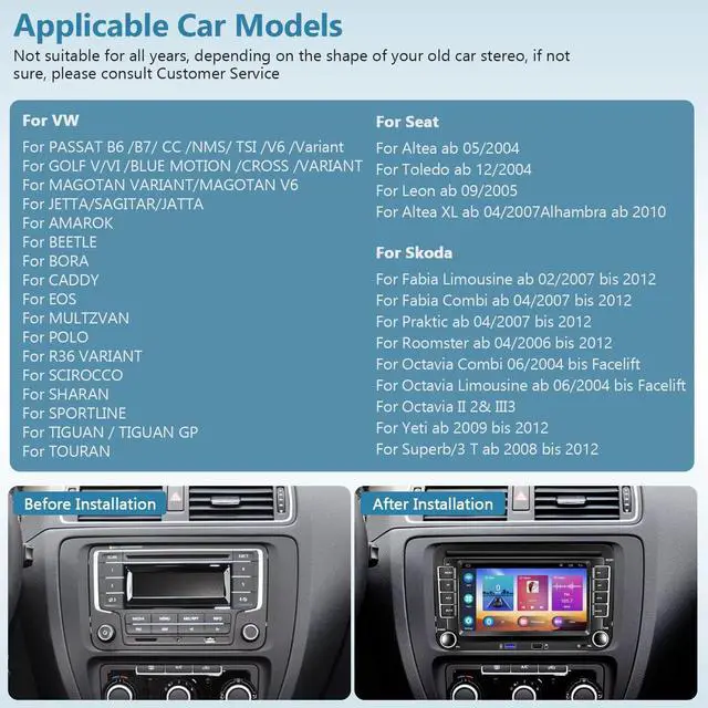 Volkswagen Series: 7 inch touchscreen car stereo fits forVW Passat Jetta Tiguan Golf MK5 MK6 T5 EOS POLO etc. No need additional frame, it includes a Plug and Play wiring harness for a effortless installation experience ^^ Wireless Carplay /