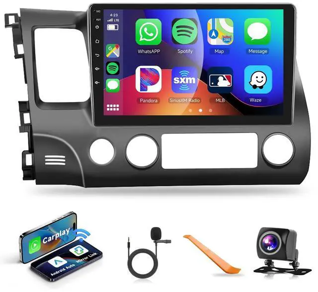 Honda Civic Android Head Unit: New Android system, 10.1 inch 2.5D 1080P HD touch screen, 2G RAM+32G ROM, offline/online GPS navigation, Wifi connection, RDS/FM radio, two USB, DSP Audio and EQ adjustable, with waterproof HD rear view camera, support Android/IOS smartphone mirror link, steering wheel control. This double din radio is perfectly suitable for Honda Civic 2006 2007 2008 2009 2010 2011 stereo radio, and no need to purchase additional accessories ^^ 2. Wireless Carplay and
