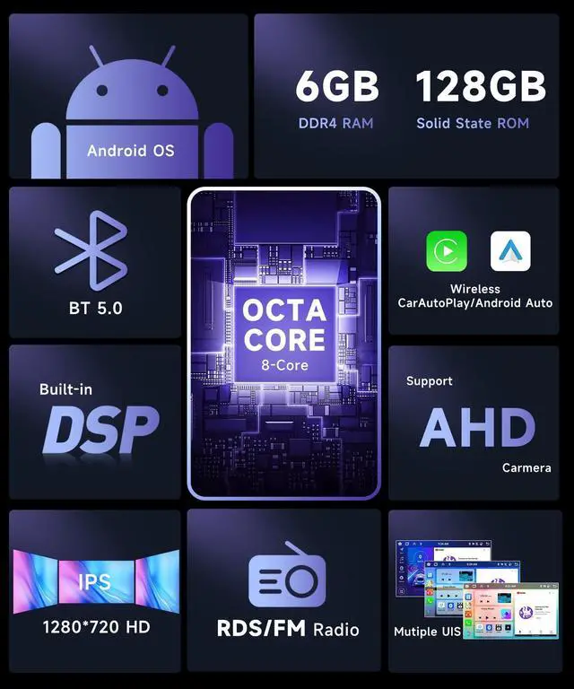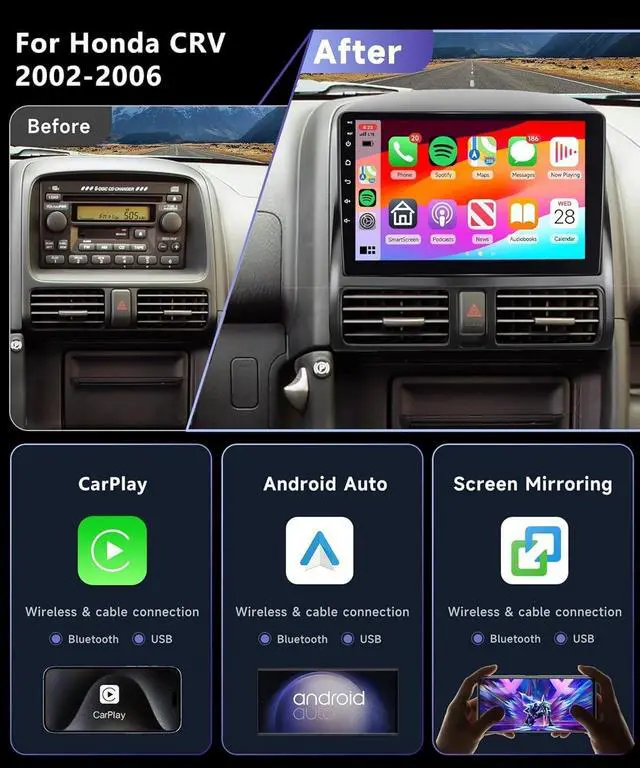 WiFi Internet: This double din car stereo fits for Honda CRV 2002-2006. Android car stereo features upgrade Chip, 6GB RAM runs more smoothly, 128GB ROM, more large storage to download Apps. Connected with WiFi, You could download various Apps from Goo-gle Store, Like Waze, Spotify, Goo-gle Maps etc ^^ 3. SWC & Split Screen Our CRV Car audio with steering wheel control function allows you to take easy control on switching songs, hands free calls, volume control, more convenient when you are driving, so that you will not be distracted by driving. Besides, the split screen mode of the 9 inch stereo screen can help you handle things better at the same time to meet your efficiency needs ^^ 4. Wired & Wireless Carplay Android Auto Choosing wired connection via USB cable or Wireless connection by Bluetooth, CRV car stereo head unit support Carplay and Android Auto, you could use various mobile Phone Apps on the touch screen such as Waze, Spotify, Pandora etc. Voice assistants will help you voice control, for safe driving ^^ 5.5. 0Bluetooth & DSP 46EQ & FM/RDS Radio This for CRV 2002 Bluetooth Stereo with 5.0B luetooth chip, Support hands-free calls, open phone book, Bluetooth music.