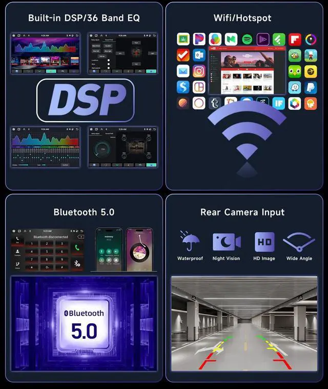 DSP 46EQ Audio allows you to have different Music style. FM/RDS radio allows you to enjoy music and news bulletins ^^ 6. Car Stereo with IP67 & AHD Backup Camera The car audio head units support rear view camera input, which features waterproof, 170wide-angle, high definition, night vision. Connect the reversing camera, CRV touch screen car stereo display will automatically turn to the rear view details.