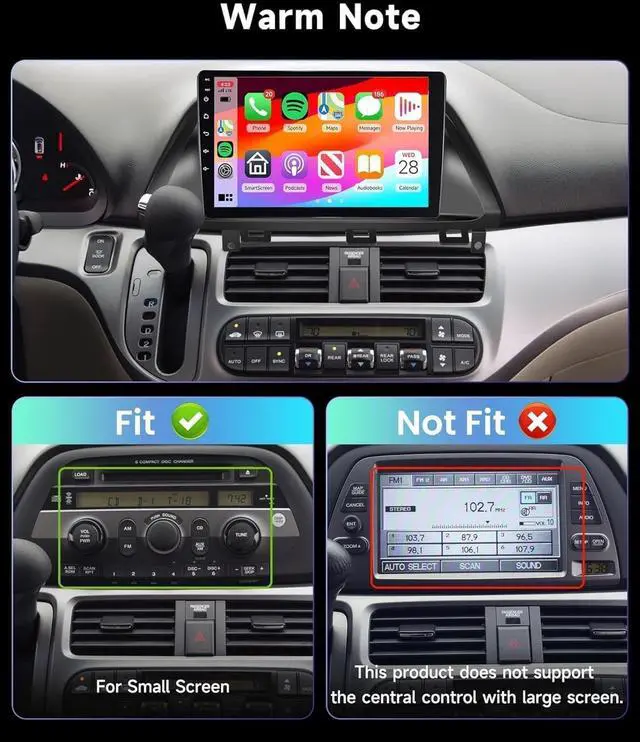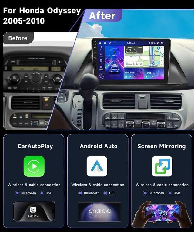 1. Applicable ModelsThe radio for Honda Odyssey is compatible with original factory car radio for Honda Odyssey 2005 2006 2007 2008 2009 2010. Please check the year, dimensions and shape of the center console of your vehicles before purchasing. If you are not sure, you can send messages or picture to us, we will give you advice. Click the seller's name on the product page: Podofo TechAsk a questionSend message to seller ^^ 2. Octa Core 6G+128G Car Radio Stereo for Honda OdysseyOur Android car stereo with 10.1 inch 1280*720 IPS Touch Screen built-in octa core CUP processer, 6GRAM + 128G ROM large memory, ensures smooth operation and faster response, 128 GB ROM for more apps installed. WiFI, On-line surfing Available. Car Stereo for Honda Odyssey 2005 allows you install android Apps from Application Store. You are driving with a smart Car stereo like a ipad ^^ 3. Wired/Wireless CarPlay & Android AutoThis for Honda Odyssey 2006 radio support wired/wireless CarPlay and Android Auto, you could more easily access the apps of your phone. You can also able to wake up the voice assistant Siri or Goo-gle Assistant to operate Apps on this head unit for Honda Odyssey 2007 easily use GPS navigation, calls, message, music, and much more functions while keeping your hands free for safe driving ^^ 4. 59UI Themes & Customize Home Page APPs This bluetooth radio for Honda Odyssey 2008 spports split-screen functionality, allowing you to use two apps simultaneously and customize the size and position of each app.