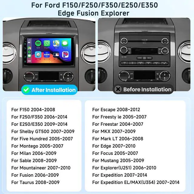 Applicable Models: This car radio fits for Ford F150 2004-2008, Ford F250 F350 2006-2014; Ford E250 E350 2009-2014; Ford Edge 2007-2010; Ford Taurus Sable 2008-2009; Ford Fusion Milan 2006-2009; Ford Focus Montego Freestyle 2005-2007; Ford Explorer U251 2006-2010; Ford Escape 2008-2012; Ford Expedition 2007-2014; Ford MKX 2007-2009; Ford Mark LT 2006-2008; Ford Mustang 2005-2009; It includes a Plug and Play wiring harness and retains the Original Factory frame ^^ Android 15
