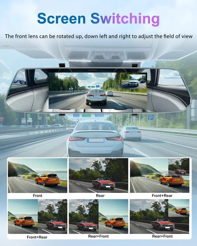 Mirror Dash Cam: Upgraded 7-inch screen rearview mirror, equipped with 1080P front camera and 1080P rear camera. Using large diameter front and rear lenses and mature WDR technology. With aurora capture technology, the image can be brightened or darkened when encountering tunnels, night lights, etc. The adjustable front camera and 120 rear camera cover almost the entire field of view, reducing blind spot areas and capturing more road scenes. ^^ Dual Cam Simultaneously RecordingThe mirror dash cam captures both the front and rear views of the vehicle at the same time, which provides comprehensive coverage and ensures that any events or incidents occurring are recorded simultaneously. Additionally, keep a clear and complete visual record of the road ahead and behind. ^^ Super Night Vision & Six Display ModesMirror Dash Cam Front and Rear Camera equipped with superior sensor, the dash cam captures sharp videos with enhanced details at extreme low light conditions. HDR wide dynamic processing technology, imaging is more clear. Another benefit of high pixels is excellect color reproduction, which can more realistically record the colors and scenes in the driving environment, which is very helpful for accurately recording facts in the event of an accident.
