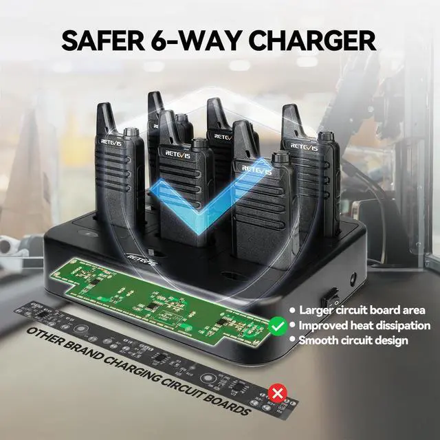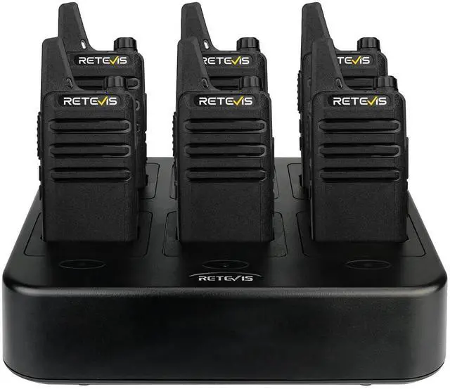 FRS license free two way radio; extremely compact and slim for business use; featured with 16 channel; work right out of box; you don't need a license for RT22 walkie talkie ^^ Includes six way multi gang charger; with multiple charging protections; overcharge; over voltage and short circuit protection; more safer for charging the 6 pack 2 way radios at the same time ^^ Fits in your palm; handheld radios walkie talkie; easy to carry around and simple to operate; save space; antenna length 7 inches; 3.78 * 2.17 * 0.87 in; weight 108g ^^ USB charging allows you to charge it at any time; 1000 mAh battery supports 10 hours of battery life; 5% reception; 5% transmission; 90% standby ^^ Key lock; use this function to save the current settings; reducing work insecurity caused by frequent operations and mistakes caused by accidentally touching other buttons when busy