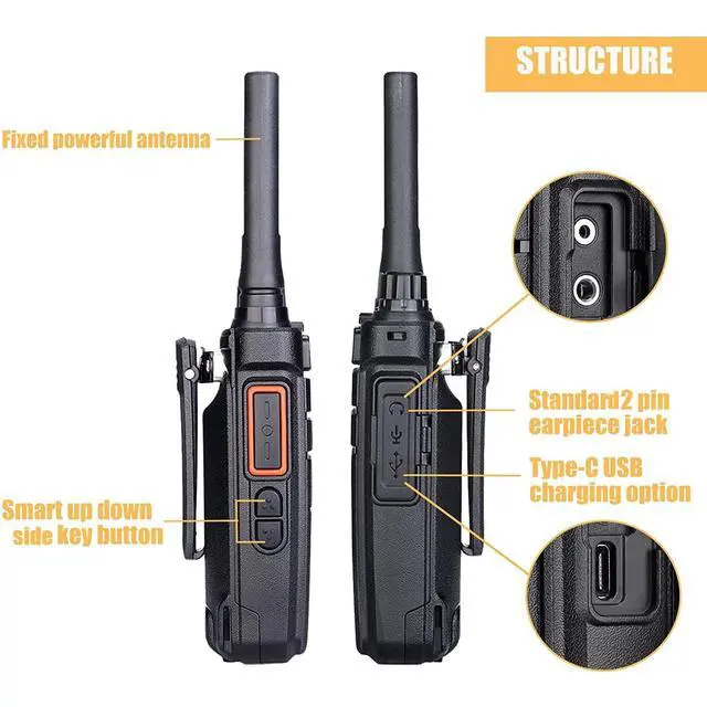 Please note that RB26 walkie-talkie can talk directly to channels 1-5 of H-777 RT21 RT22 RT68 RT27 H777S; RB26 cannot communicate directly with other brands of walkie-talkies; if you need; please contact us via mail ^^ High power two-way radio; 30 channels; 3 watts for channels 1-7 and 15-22; authorized power is higher than other walkie-talkies; can travel longer distances in the same environment; Support CHIRP ^^ Long battery life walkie talkies; 2000mAh battery lasts 20-21 hours (battery life is calculated at 10% transmission time and 90% standby time) ^^ Portable 2 way radio; large diameter flashlight provides more security for your work after dark; desktop charging dock and Type-C USB two charging methods ^^ Multi-functional two way radios; LED flashlight for emergency lighting; emergency alarm for safety; VOX-ready; VOX needs to be turned on via firmware; quiet noise; RB26 two-way walkie-talkie designed for optimal audio clarity; for reliable field communication