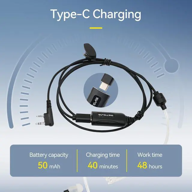 AI active noise reduction walkie talkie earpiece; equipped with an AI noise reduction chip; reduce the background noise; no matter how noisy the workplace is; achieve clear communication ^^ Comfortable wearing; using an acoustic tube; 33g/ 0.08 lb weight; and soft material; you can wear the radio earpiece comfortably; without feeling much pressure ^^ Rechargeable walkie talkie earpiece; 50mAh battery; up to 48 hours of continuous use time; standard type-C charging port; work in nightclubs; concerts; a whole day without worries ^^ Spare earbud; if the original one is damaged or broken; quickly replace it with the new one; it won't affect the use ^^ Wide compatibility; K head 2 pin; compatible with Retevis RT22 RT21 RT68 RT68H H777 H777H RT27 RT86 RT86A RT86S walkie talkies; compatible with Pxton Baofeng BF-888S BF-T26 Kenwood