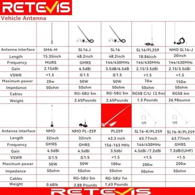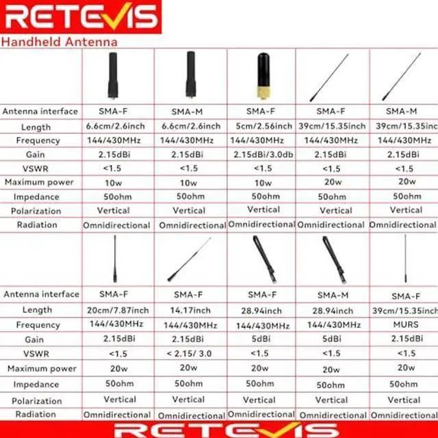 10 pack walkie talkies antenna fits perfectly most brands radios; works as good as original two way radio antenna ^^ Dual band antenna with frequency 144/430MHz of 136-174+400-480MHz; connector sma female; VSWR < 1.5 ^^ Max power 10W boost the signal for great transmissions and reception ^^ Nice size keeps you from getting caught up with the longer whip; length 5cm ( 1.96 inch) ^^ SMA-F antenna for Retevis RA79 RT29 RT86 RM21 RT29D RB85 RT5R RT56 RT43 RB22 RB25 P1 HD1 HD2 A1 EZTalk 2 RB26H RM22 C2 RB58; compatible with BAOFENG BF-F8HP UV5R UV-82 Kenwood TK-250 and more