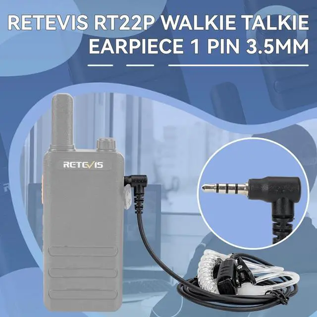 1 pin 3.5 mm for Retevis RT22P; walkie talkie earpiece is only compatible with Retevis RT22P RB19 RB19P B3H B3S two way radios ^^ Clear sound quality; walkie talkie earpiece with mic and speaker; speaker impedance is 32 ohms and mic sensitivity is 38 for crystal clear audio ^^ Provide private calls; two way radio earpiece adopts air conduction transmission design; in-ear earplug make calls more private ^^ Side PTT; 2 way radio earpiece features compact side PTT which is easy to operate and press ^^ Detachable; interface between walkie-talkie earpiece covert tube and wire can be disassembled; it is convenient to clean covert tube