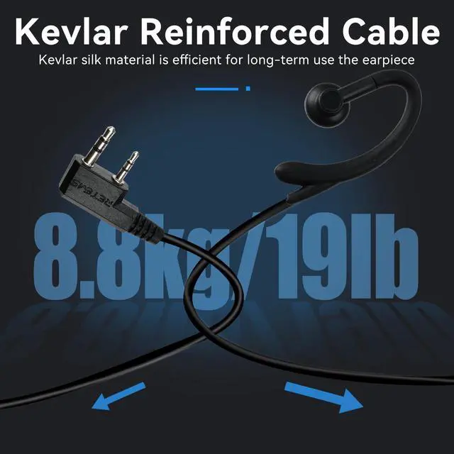 Clear sound quality; comes with a 150 HD speaker; earhook earpiece offers a clear sound quality for clear communication during use ^^ Good durability; surveillance earpiece cable is made of high-strength Kevlar bulletproof silk material; withstands 8.8 kg/19Ib weight and deals with the pulling and other situations during use ^^ Full-size PTT key; makes communication more convenient; even when you wear gloves; you can operate the PTT key to communicate ^^ Coiled cable design; reduces the possibility of cable problem; enables users to use the ear piece for walkie-talkie without worrying about cable trouble ^^ K head 2 pin; compatible with Retevis RT22 RT21 RT68 RT68H H777 H777H RT27 RT86 RT86A RT86S walkie talkies; compatible with Pxton Baofeng BF-888S BF-T26 Kenwood