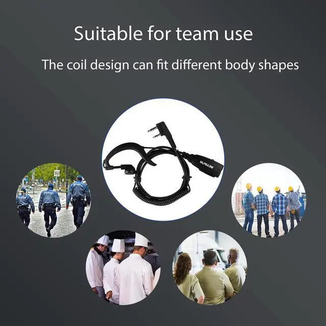 Crisp sound quality; 2 way radio headset with sensitive mic to pick up clear nature sound for smooth transmitting; no distortion or attenuation; comfortable press feel ^^ VOX function; walkie talkie headsets with VOX function; no need to press the PTT to transmit; greatly liberates the hands ^^ G shape earhook; G shape ear piece for walkie-talkie; different from traditional headset; ergonomic design; more comfortable than the other ear hanging type 2 way radio earpieces; suitable for more customer group ^^ Coil design; adjustable radio earpiece cable; the length can be 13065cm; can meet the needs of different body shapes in the team ^^ K head 2 pin; compatible with Retevis RT22 RT21 RT68 RT68H H777 H777H RT27 RT86 RT86A RT86S walkie talkies; compatible with Pxton Baofeng BF-888S BF-T26 Kenwood and more