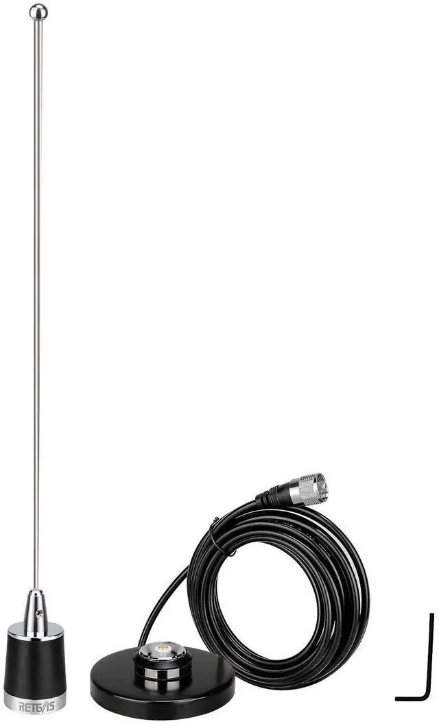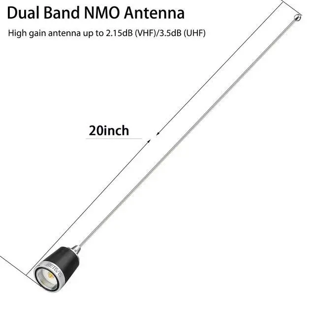 Effectively improve your communication quality; dual band antenna long 20inch, works on frequencies UHF VHF 144 430Mhz(136-174+400-470)MHz; and equipped with induction coil to increase gain 2.15 dB (VHF) 3.5 dB (UHF) ^^ Strong magnet base and suction; excellent single-section magnetic antenna has the base with a diameter of 3.5 inch; not only great magnet with antenna; also firmly attached to the car ^^ 4 meters long standard RG 58 coax cable; 50 Low Loss RG58 coax cable perfect work with the antenna and radio; connection with the magnetic base is super stable ^^ Perfect match for the antenna and base; antenna; magnetic base and RG58 coax cable is all included in the package; no need to worry about that get the mismatched antenna or base ^^ Longer life with more durable materials; the antenna set is waterproof and anti-corrosion because of the stainless steel and superior copper wire; more suitable for outdoors
