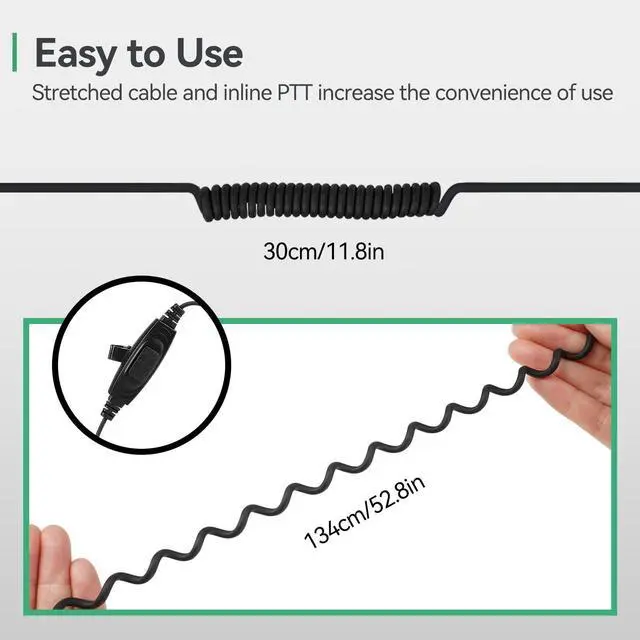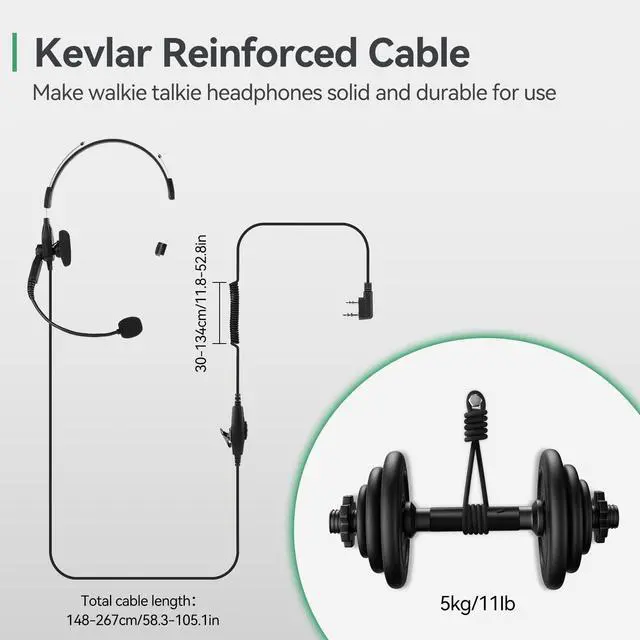 Adjustable headband; allows users to adjust the headband to suit their head size; stably attached to their head for long-term carry ^^ Comfortable to wear; 2 way radio headset uses a soft earbud and 85g/ 0.19I b weight; enabling you to wear a headset without having too much pressure ^^ Kevlar reinforced cable; withstands 5kg/11Ib weight; walkie talkie headphones have strong durability for long-term use ^^ Coiled design; the cable length can be extended to 134cm/ 52.8 inch; bring convenience for different heights use ^^ K head 2 pin; Compatible with Retevis RT22 RT21 RT68 RT68H H777 H777H RT27 RT86 RT86A RT86S walkie talkies.