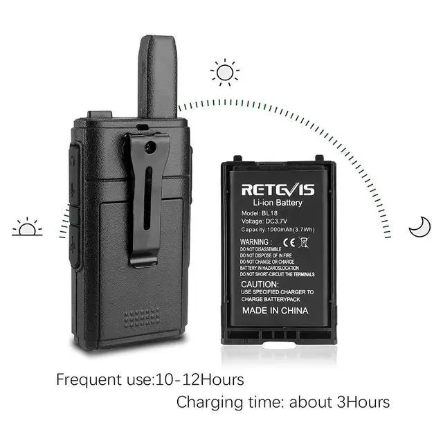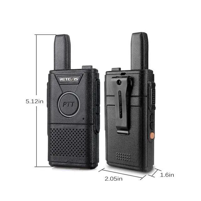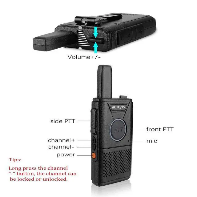 Small compact and easy to use walkie talkies; less than 0.6 inches thick; weighing only 0.26 pounds; it can be easily held by both adults and children when picnics; camping; short hikes ^^ Double PTT design; which means that you can push the side button to talk like a normal walkie; also you can push the big center round button with PTT on it to talk; the large round button is easier for kids or seniors to see and use with their fumbly hands and fingers ^^ Breathing light; the colored LED circle around the front PTT button is helpful to locate the device in the dark; as well as confirm that it is on; working properly and ready for use; the breathing light flashes to indicate that it has entered the standby state ^^ Sturdy metal back clip; can clip it to a belt or backpack; you dont have to worry about the back clip breaking or deforming ^^ Key lock; long press the channel down button to hear two beeps; and you will fix the current channel; long press the channel down button again; after hearing one beep; you can change the channel normally