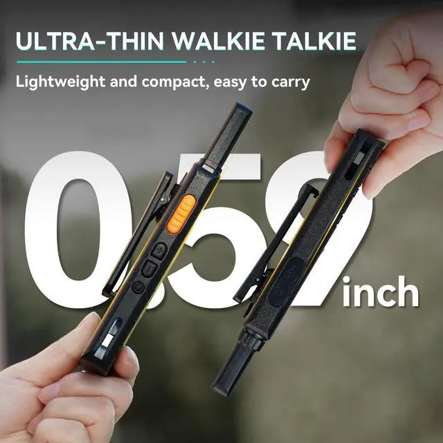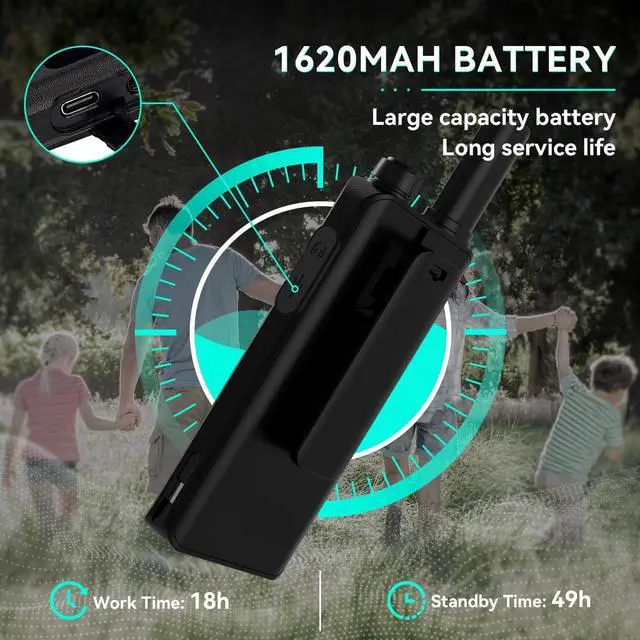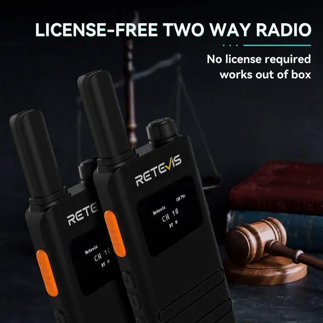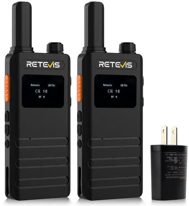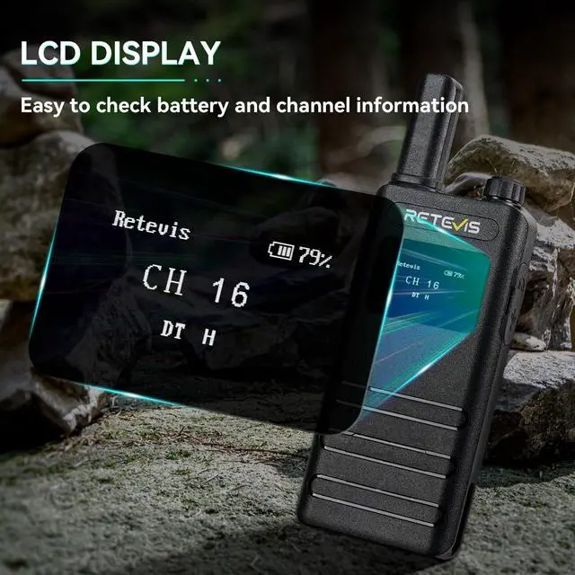 Walkie talkie with LCD screen; can learn about the battery; channel informaton and function operationsunbreakable screen ^^ Ease of use; ready to use out of the box; License-free 2 way radio; compatible with other Retevis FRS 2 way raidos on the same channel and CTCSS/DCS; such as retevis RT22 H777 RT21 RT68 B3H B3B RT22P etc ^^ Lightweight and compact; ultra-thin 2-way radios; 0.59 inch thickness; weight is 0.23 lb; looks like a phone and fits hands well ^^ Long battery life; rechargeable walkie talkies with 1620mAh Battery; support 18 to 24 hour continuous use; USB-C charging method; 2-in-1 charging cable; convenient to recharge two walkie talkies simultaneously ^^ VOX hands-free; shortly press the Function Key to access the main menu; then press the +or-key to switch to the VOX menu; shortly press the Function Key enter the VOX function; press the +or-key to set OFF or 1-10 level; after setting successfully; press the Function Key to confirm and return to the previous menu