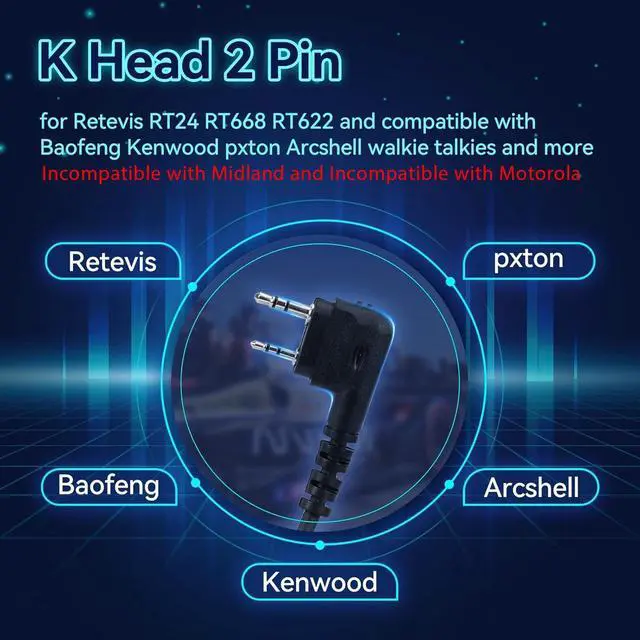 K head 2 pin; for Retevis RT21 H-777H RT68 RT68H RT22S H777S RB29 RT86 RB26H RT22 MateTalk B4and more; compatible with Baofeng UV-5R BF-F8HP BF 5RM two way radios; compatible with Kenwood walkie talkies and more; Incompatible with Midland and Incompatible with Motorola ^^ Clear sound quality; flexible boom mic; noise reduction two way radio headset provides clear communication in noisy environments; suitable for noise environment such as photography; range; film and tv production; racing games; sports events; industry campus calls etc ^^ Adjustable volume; the maximum sound threshold of the headset is currently 82db; there is a volume adjustment knob on the side of walkie talkie headset; when your environment requires louder or softer sound; just gently turning the knob aand then you can achieve ^^ Foldable design; rotating ear cup; walkie talkie headphones adopts a foldable design; fold it up and put it in your bag when not in use; it does not take up a lot of space and easy to carry ^^ Durable cable; strong coiled wire visible to naked eye effectively increases the life of 2 way radio headset with mic; unstretched length of wire is 3.81IN /116CM and stretched length is 9.19IN /280CM, more flexible to use and suitable for people of different heights ^^ Note; like most communication headsets; the headband is designed to provide a secure fit; it may feel slightly snug at first but will become more comfortable after short-term use; for the best comfort and noise reduction; make sure the ear cup fully covers your ear instead of resting on it