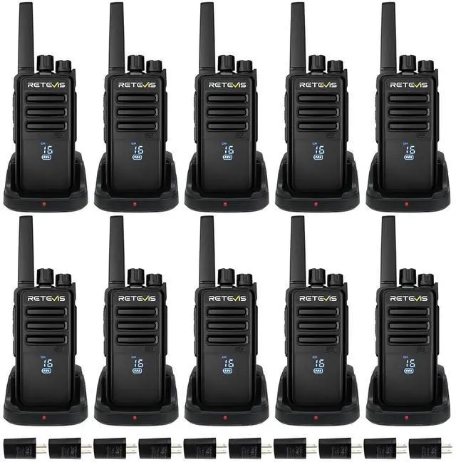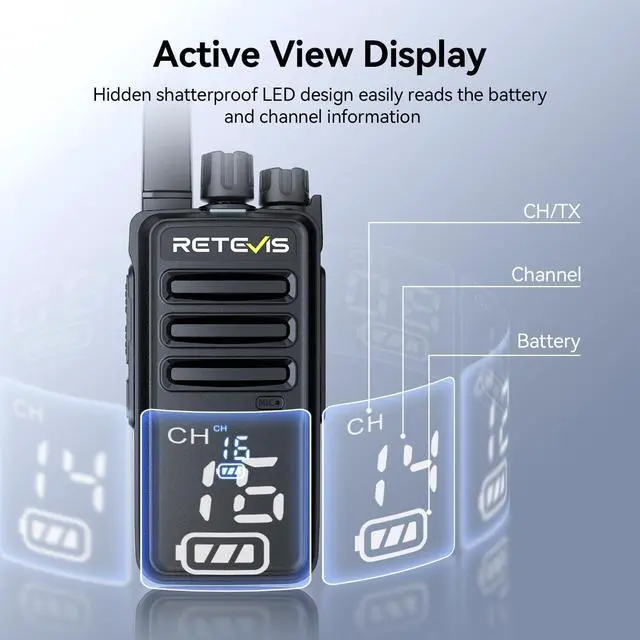 Durable and Intuitive; walkie talkie with screen; in contrast to LCD display; shatterproof hidden display uses LED lighting; convenient for checking the current channel and battery information ^^ Desktop charger and direct charger; standard Type-C charging port supports reverse insertion; convenient to recharge radios during use; 1200mAh lithium battery; continuously use up to 10/15 hours for a-whole-day work ^^ Long range Heavy duty walkie talkies; able to use normally after falling from 1 meter in height; available for hospitality/property management/schools/security and various occasions needs ^^ Secure communication; Keypad lock; which is efficient in preventing any accidental operations and disconnects with team members; unlock it by short pressing the side button; 50 CTCSS and 210 DCS; preset sub-audio provides more call options ^^ Crisp clear sound; Retevis RT68H walkie-talkie professional has a loud speaker and features a 0-9 squelch function; transmitting and receiving clearly in a noisy environment