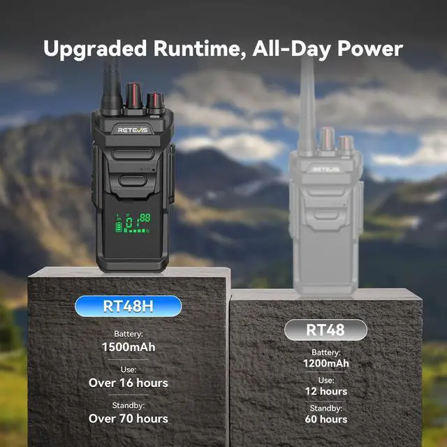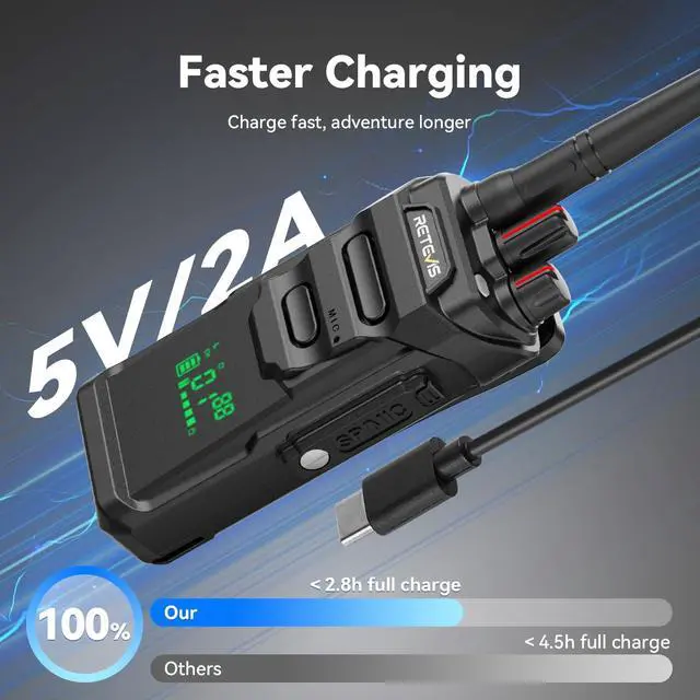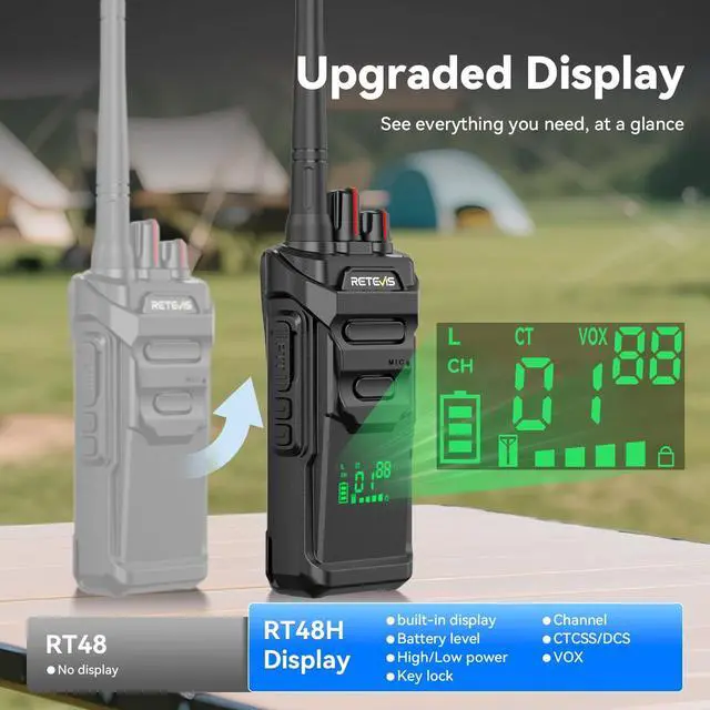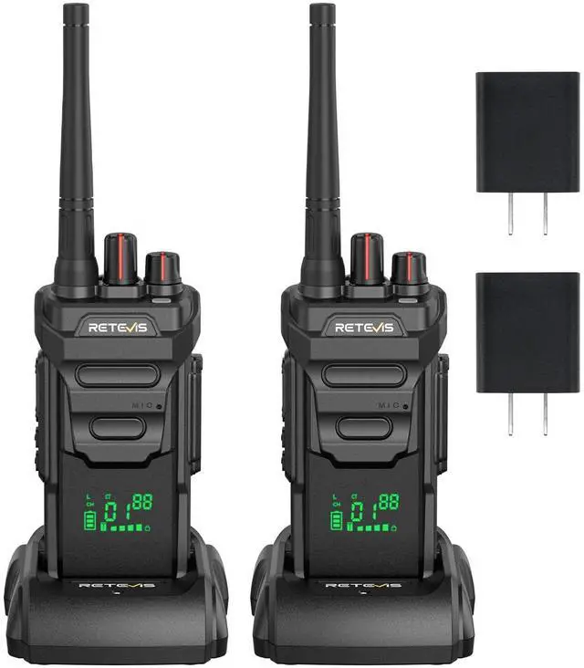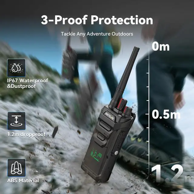 Heavy-duty radio; easily handles all weather and harsh environments; waterproof radio can be immersed in 1 meter of water for 30 minutes; 1.2 meter drop resistance makes it able to withstand accidental falls from rocky cliffs or slippery boat decks ^^ Visual Walkie Talkie; Stay safe; Two-way radio with built-in display shows key information like battery life, channel and power mode; Perfect for adjusting settings mid-hike to save battery or switch channels ^^ Faster charging; Fully charges quickly; Save more time; 1.5 -2 hours of charging via Type-C or docking station gets you on the road faster; Ensures your waterproof and shockproof walkie-talkie retains power during multi-day hikes or emergencies ^^ Long battery life; Over 16/24 hours of non-stop communication; right for weekend camping trips or all-day hikes without recharging; 1500mAh battery and the 70 hours standby mode ensures your 2 way radio is ready when you need it ^^ Emergency alarm; trigger help instantly; activate a loud local alarm of 2 way radio to alert nearby hikers if youre injured; or send a remote SOS via channel to notify base camps or rescuers ^^ Easy to use; just turn on the two way radio; select a channel; and start communication; right for spontaneous camping trips or impromptu rafting adventures where you dont have time for tech setups ^^ Reach further; long range walkie talkie with 300, 000 sq ft and 25 floors indoors; right for cave exploration or multi-level lodges ^^ Strong compatibility; switch 22 channels to 16 channels to be compatible with RT48; communicate with mixed-group adventurers; works with RT22/RT21/RT68/RT49/H777; for guided tours or multi-team expeditions ^^ Communicate with hands-free; activate VOX of walkie talkie to transmit without pressing buttons for kayaking; climbing; or biking; adjust sensitivity for quiet environments or noisy ones to ensure clear voice activation