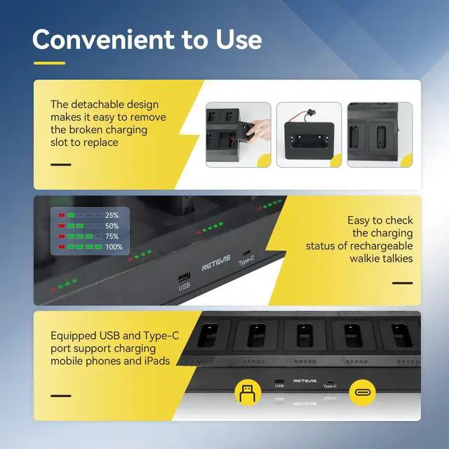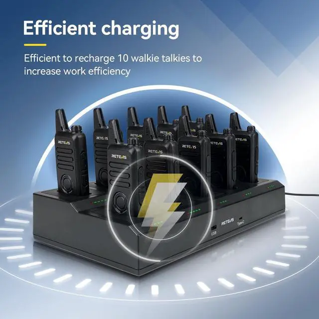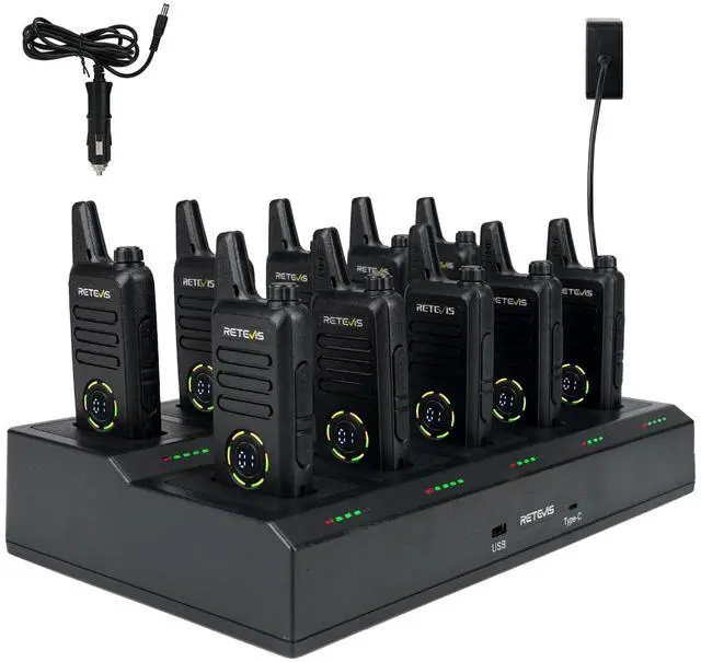 Upgraded version of the 10-channel multi-pack charger; it can charge 10 walkie-talkies at the same time, which is more efficient than charging 6 walkie-talkies at the same time; saving time and space ^^ Channel display; easy to confirm the current channel and quickly pair; flashing circle indicator light facilitates the distinction between receiving and transmitting working status ^^ Portable FRS walkie-talkie; size 5.35 * 2.20 * 0.83 inch and weight 0.24I b; can be easily carried whether in a backpack or pocket; suitable for a variety of working scenarios; such as community apartments ^^ Easy to use; 10-channel multi-pack charger charging card slot is removable to facilitate later replacement and save costs; charging progress indicator light indicates charging status; USB and Type-c output port support charging mobile phones and Pads ^^ Walkie talkie charger supports AC and DC power supplies; bring convenience for recharging walkie talkies when work indoors or outdoors; overheat protection to enhance charging safety ^^ VOX Hands-Free; Once VOX is turned on; you can communicate without pressing the PTT button ^^ 2-Pin Headphone Jack; Compatible with 2-pin earpieces for more convenient communication
