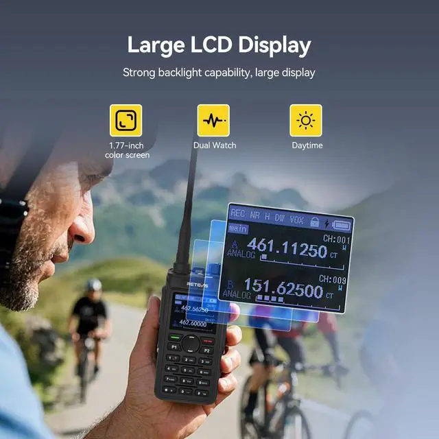 Walkie talkies long range; high power provides up to 350, 000sq. ft; 30000sq. m communication range; you can call your members smoothly; no matter which work position they are in ^^ Easy pairing; without complex settings; you can pair with other GMRS walkie talkies easily; improving work efficiency ^^ Intuitive check; walkie talkie has a 1.77 inch LCD screen and supports 5-level brightness adjustment; you can check the battery power and channel information clearly; whether under bright or dim light ^^ Clear communication; AI noise reduction chip filters out the noise from the surroundings; remains real voice; making calls clear in noisy environments ^^ Rechargeable 2-way radio; 2000mAh large battery capacity; 17 hours of use; 100 hours of standby; type-C port and two charging methods; you can go out or work for a whole day without worries