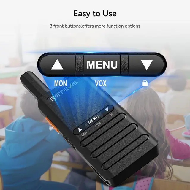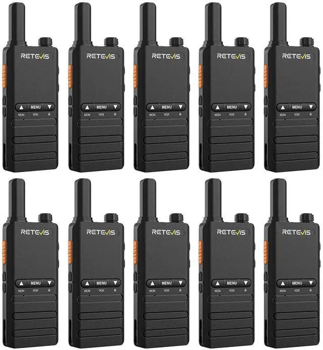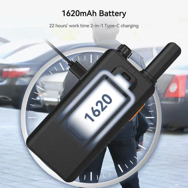Easy to operate; compared with ordinary walkie-talkies without buttons on the front; the three buttons on the front can directly open common functions such as vox; squelch; key lock; convenient and fast; saving time ^^ Palm size and simple mini walkie talkie allows businesses to communicate efficiently with easy to use features; making it easy to carry around ^^ 1620mAh rechargeable battery; supports 22 hours communication under typical use; 2-in-1 usb-c charging cable allow to charge 2 walky talky simultaneously; improve charging efficiency; support computer power; power bank; car charger; ect ^^ Built-in speakers and microphones on radios provide a loud and clear sound; antenna impedance 50; 1-7 squelch; short press menu twice continuously; the voice prompts squelch; and enter the squelch adjustment ^^ VOX hands-free walkie talkie; after activating this function; no need to press the PTT button; just need to speak to the microphone of the walkie talkie; the signal will be transmitted automatically ^^ Local alarm and remote alarm; ask your companions for help immediately; suitable for commercial scenarios; such as hotel management; villas; restaurant kitchens; factory warehouses; car driving; school; churches; retail stores and supermarkets; security personnel; safety maintenance personnel etc ^^ License-free two-way radios; no license required; can be used legally and safely in the United States; featured with 16 channel; can talk directly with other Retevis FRS radios with 16 channels on the same channel and CTCSS; such as Retevis RT22 RT22P RT21 RT15 RT68 H-777 B3H B3S RT22P etc ^^ Key Lock function; It is efficient to prevent channel change from accidental operations and stay connected with co-workers; Long press down key from the front to toggle the key lock