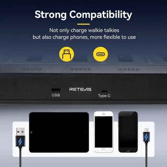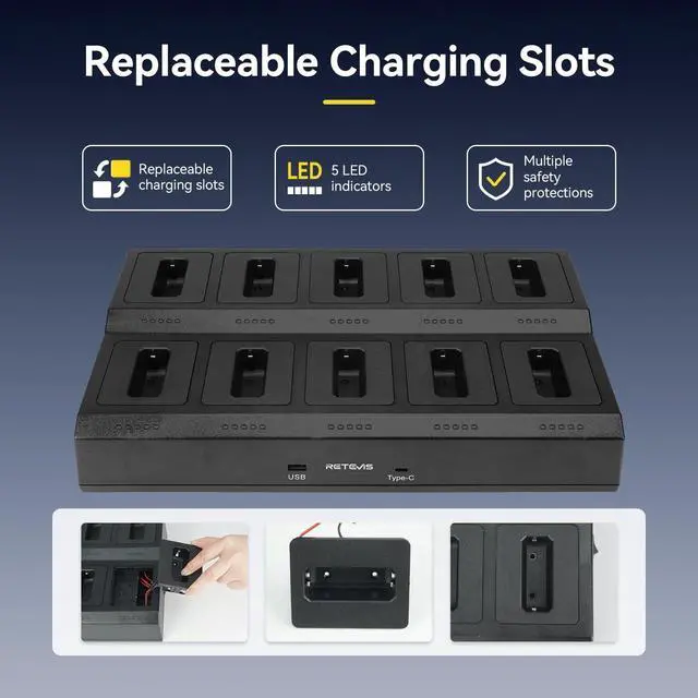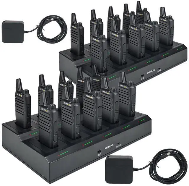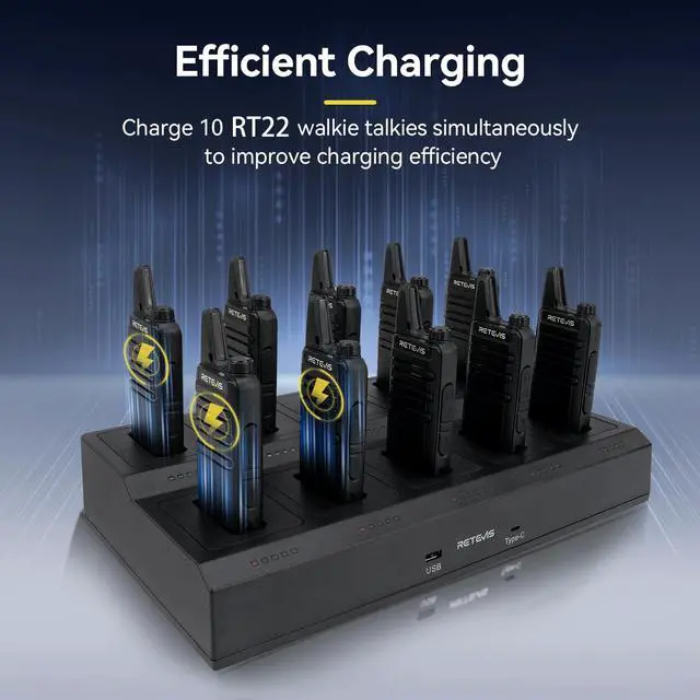 More efficient charging; upgraded slot capacity; 10 way charging supports charge 10 walkie talkies at the same time; keeps the desktop clean and tidy; without messy wires; and helps work proceed quickly ^^ Safer charging; the charger includes overheating protection; overvoltage and overcurrent protection functions; UL certification; can improve charging safety ^^ More intuitive charging; optimized old multi-way charging instructions; equipped with independent LED indicators and progress bars; clear view of the charging status of the 10-way charger at any time; and each charging slot is easy to remove and replace ^^ 1000 mAh battery supports 10 hours of battery life; 5% reception; 5% transmission; 90% standby ^^ Easier to carry; the RT22 mini walkie talkie is light and portable; the small size makes it easier to put in the pocket; it is easier to carry when working in restaurants; hotels