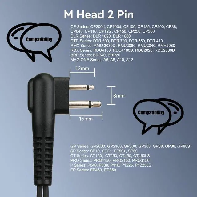 • M head 2 pin; compatible with CP185 CP100 CP100D CP200 CP200D GP300 GP2000 BRP40 A8 RMU2040 RMU2080 RMU2080D RDU4100 RDU4160D RDM2070d RMV2080 DTR550 DTR650 DTR700 DLR1020 HYT TC610 walkie talkies and more; can't compatible with any Retevis walkie talkies