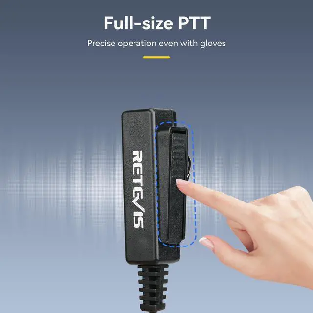 M head 2 pin; compatible with CP185 CP100 CP100D CP200 CP200D GP300 GP2000 BRP40 A8 RMU2040 RMU2080 RMU2080D RDU4100 RDU4160D RDM2070d RMV2080 DTR550 DTR650 DTR700 DLR1020 HYT TC610 walkie talkies and more; can't compatible with any Retevis walkie talkies ^^ Clear sound; the microphone hole of walkie talkie headset is much larger than the normal one; it provides clear and loud sound transmission ^^ Full-size PTT; walkie talkie earpiece uses a full-size PTT; it can be operated accurately even when wearing gloves ^^ Double cable; two wayradio earpiece adopts a two-wire design; PTT/MIC and pins are located in different ports; convenient for wearing from inside the jacket ^^ Acoustic tube earpiece; make your communication more private; suitable for communication of private occasions; protect your health from radio electromagnetic wave radiation