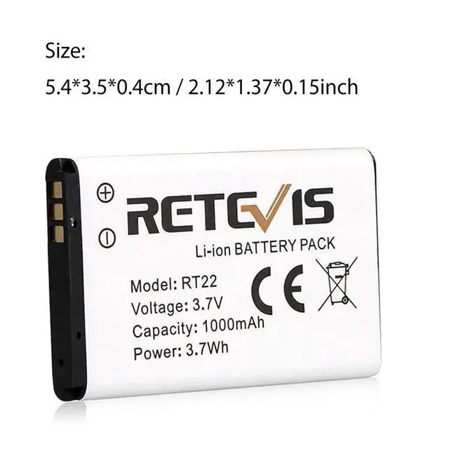 3.7V voltage; 1000mAh battery capacity ^^ Walkie talkies rechargeable battery for the Retevis RT22 RT22S RT15 two way radios ^^ Full charged can last about 8-12 hour using ^^ Light weight for easy packing during some outdoor activities ^^ Great back up for your original batteries