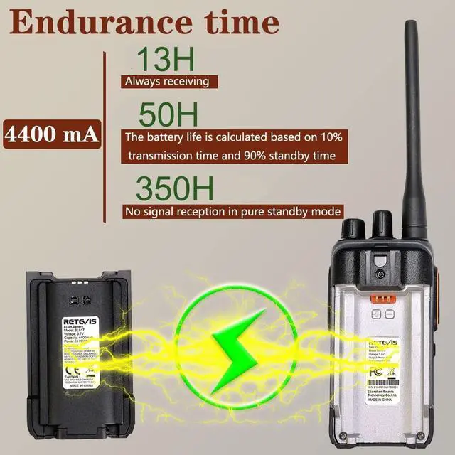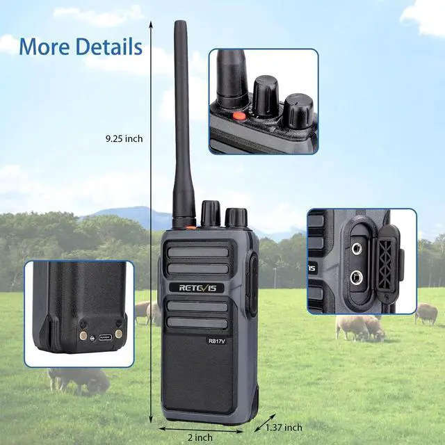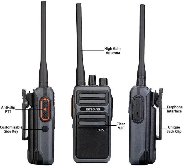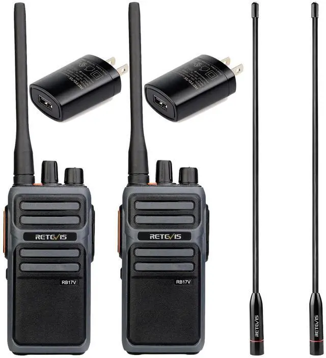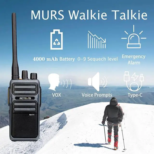 MURS walkie talkie; RB17V MURS walkie talkie can only communicate with murs walkie talkie of Retevis; if you need to talk to other brands of MURS walkie talkies; you can contact us via mail; we provide free firmware ^^ Detachable long antenna; extendable high gain antenna can be connected externally; get farther range in outdoor open environment and some remote rural areas; suitable for farms; ranches; hunting ^^ License-free; MURS walkie-talkies have 5 channels and are less crowded; you can get a better conversation experience and can reach farther in open areas outdoors ^^ Long life battery; 4400mAh rechargeable lithium battery; up to 50 hours of battery life; can last up to 14 days in standby-only mode; USB-C port is very convenient to charge ^^ VOX function allows you to operate hands-free; firmware activation requiredplease contact us via mail; we provide free firmware
