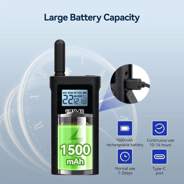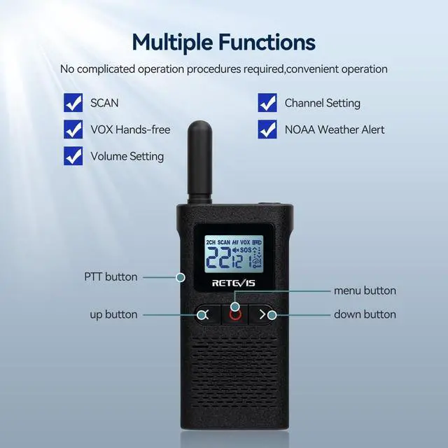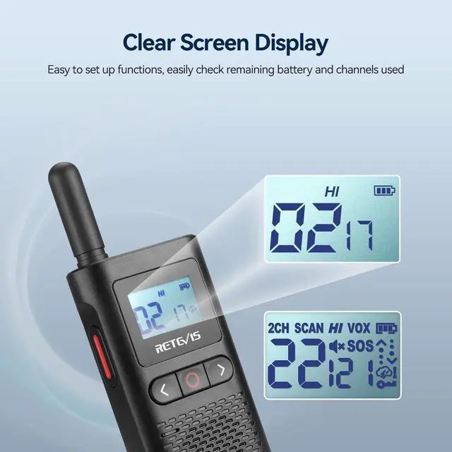Out of the box; Walkie Talkie setup is simple and ready to use; VOX and CTCSS/DCS can be set directly through buttons; eliminates the hassle of computer setup; enables teachers to communicate more timely and prepare for school safety activities ^^ Strong compatibility; license free walkie talkie has no extra fee; 22 channels; on channels 1-5; RB28 can communicate directly with Retevis RT22; RT21; H-777; RT68 ^^ Large and clear display; adds convenience by showing you channel; battery status; and other information at a glance; two way radio come with a backlit LCD screen that you can use when you walk at night ^^ Long life of 1500mAh battery; rechargeable walkie talkies comes with a high-capacity 1500mAh Lithium-ion battery which can last 10-14 hours; included 2-in-1 charging cable and adapter can charge two walkie-talkie at the same time ^^ Crystal clear Audio; walkie talkies with earpiece make your communication securer and clearer even in noisy environments; suitable for school; church; health care; clinic; retail; pet care
