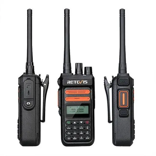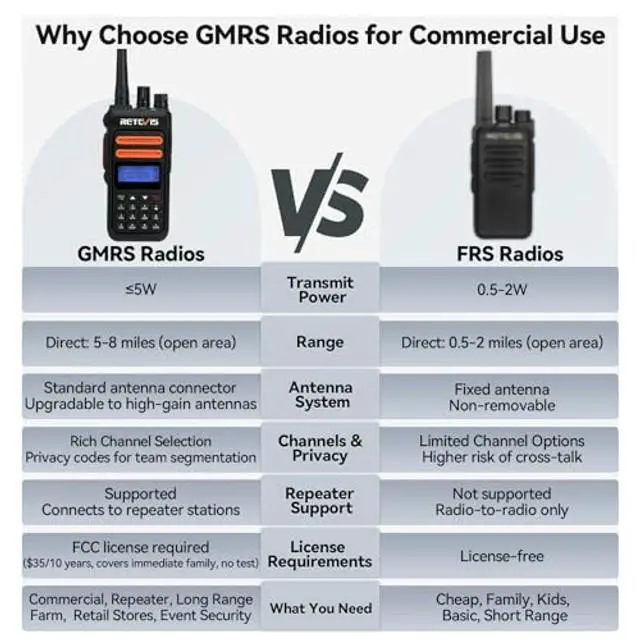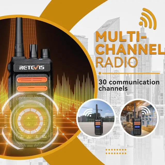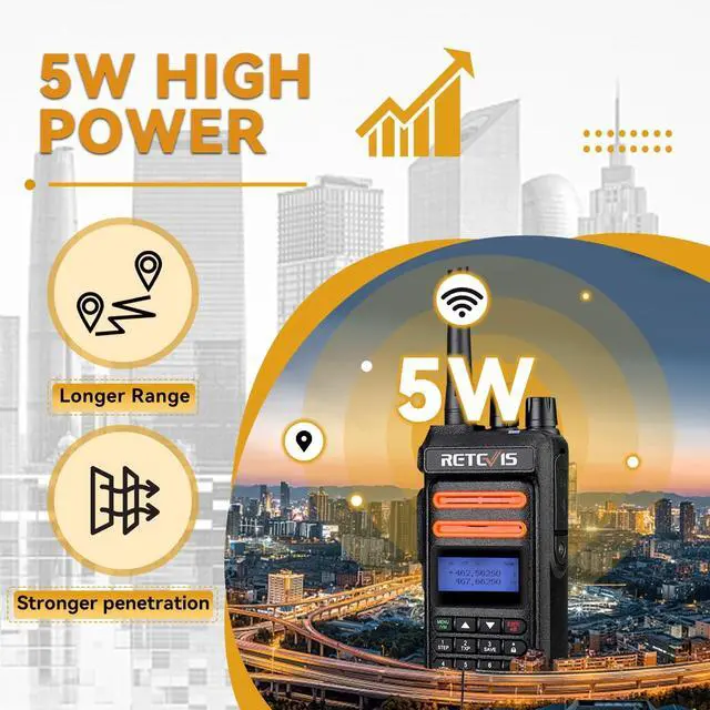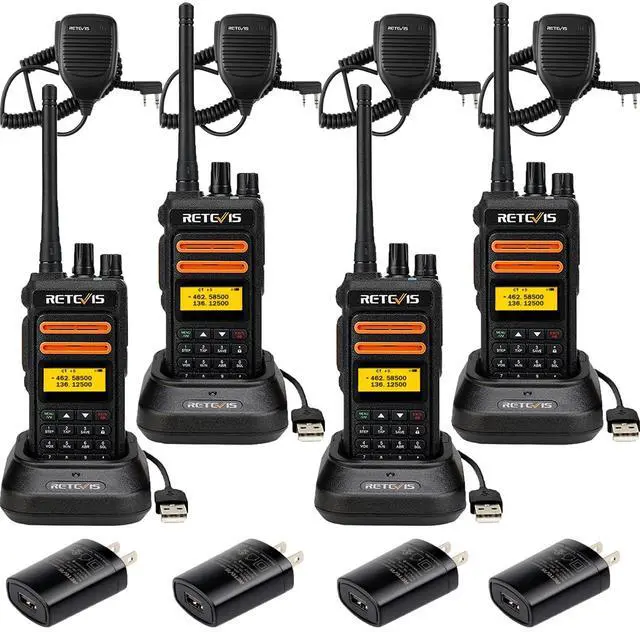 Long range walkie talkies; RT76P features 5 watts of high power output for penetration up to 30 floors; gives you clear long distance sound even in noisy; densely populated areas of buildings; high power (5W) provides strong penetration power between construction zones; low mode saves battery life ^^ Right out of the box; RT76P can communicate directly with other retevis GMRS radio; It can be set up with the same CTCSS/DCS through the screen and keypad for use with other brands of walkie talkies; support CHIRP ^^ Easy pairing; RT76P gmrs radio has preset CTCSS/DCS for each channel; If you want to pair with other brands of walkie talkies; please press "PTT+9" at the same time; then turn on the two-way radio; when you hear "off"; the preset CTCSS/DCS will be canceled ^^ Walkie talkie with shoulder mic; clear audio quality; 360 rotatable clip and stretchable cable make it more flexible to use; large key PTT button is more convenient and quicker; it is suitable for use by electricians and maintenance workers to communicate with their peers ^^ Free your hands; RT76P walkie talkies long range supports VOX; 0-10 sensitivity (keypad adjustable); 4 pack walkie talkies with mic, you don't need to hold a heavy-duty radio to use the two way radio; especially suitable for use in warehouses and farms ^^ Rugged 2 Way Radios; passes a 2-meter drop test and withstands dust; shock; and daily wear; reliable for construction sites, outdoor adventures, and campus use