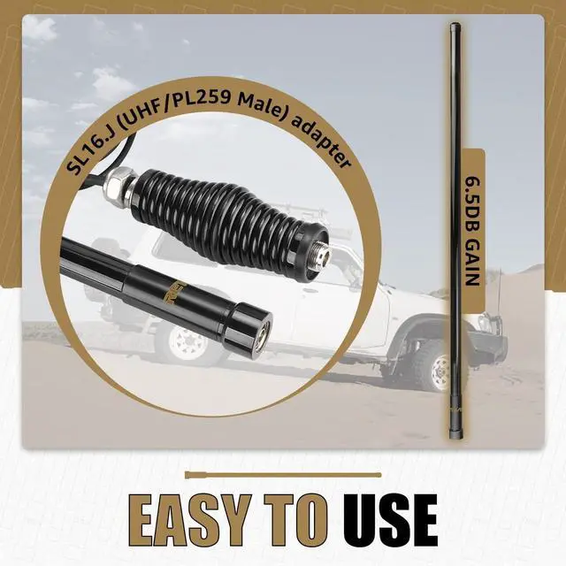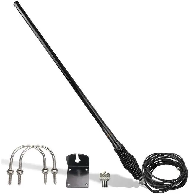 Frequency: GMRS (462-467MHz); VSWR 1.5; Input impedance 50; Gain 6.5 dB; Polarization vertical; Power 50 W; Weight 1.2 kg ( 2.6 lbs) ^^ Spring base; the spring base has great flexibility; it allows the gmrs car antenna to flex out of the way when the car is vibrating during a drive; it is efficient to reduce the damage to the gmrs radio antenna; suitable for camping and off-roading ^^ Easy to install; 16ft /5m RG-58U coaxial cable with black bracket and U-bolt; Use bolts instead of screws to fix the gmrs mobile antenna; Even if the car is shaken; the antenna can still remain stable for use ^^ Durable to use; the gmrs mobile antenna is made of fiberglass material; the mobile gmrs antenna is corrosion proof from rainwater and supports long-term use ^^ Strong compatibility; this gmrs antenna compatible with Midland GXT1000VP4/MXT275 T71VP3/MXT115/MXT575/MXT500/MXT275VP4/MXT400 Retevis RT97 RA86 RA25 RA87 RB86 GMRS Mobile Radio; Repeater; Transceiver