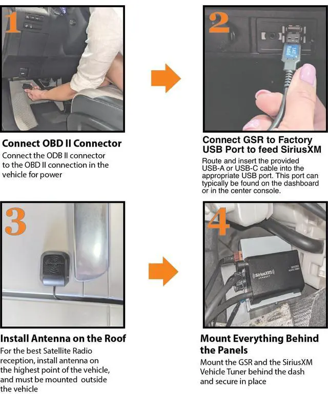 Install: Connect the OBD II connector to your vehicle's OBD II port for power. Plug the VAIS adapter into the factory USB data port to send SiriusXM data to the radio. Mount the antenna on the highest point of the vehicles roof for the best reception. Secure the GSR and SiriusXM tuner behind the dash panels. ^^ How to Add SiriusXM to your factory radio: Find the USB port in your vehicle's dashboard then plug in the adapter and activate your subscription of SiriusXM. Turn on your vehicle and select SiriusXM from the source menu then use your factory radio controls to browse and enjoy SiriusXM channels ^^