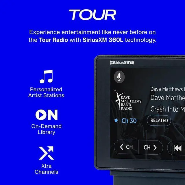 Tour is a SiriusXM touchscreen Dock & Play Radio that combines both satellite reception and Internet streaming to deliver a full complement of SiriusXM content. Incorporating SiriusXM with 360L and a touchscreen interface, Tour is the most complete and advanced entertainment experience ever offered by SiriusXM in an aftermarket radio. The Tour delivers an unparalleled variety of premium content and innovative features that make content navigation, discovery, personalization, and consumption easier than ever before. Tour provides all of SiriusXMs broadcast channels via Satellite, or online via Internet streaming. Internet streaming adds additional SiriusXM content not available via satellite such as Xtra channels, listener-created Personalized Stations powered by Pandora, and On Demand content.