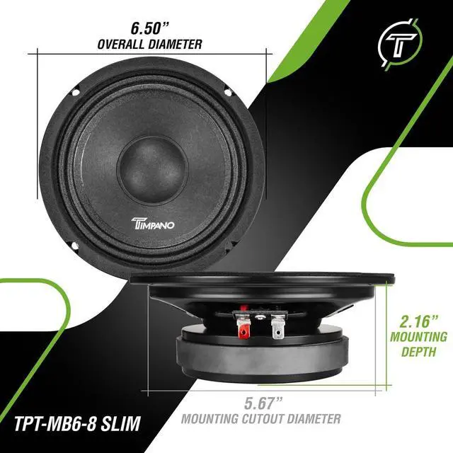 TPT-MB6-4 SLIM 6.5 Shallow PRO Audio Midbass Loudspeaker 8 OhmTimpano Audios MB Slim Series mid bass loudspeakers are designed to provide low and mid frequency sound reproduction in a wide range from a compact, slim design. These are some of the best choices for car door speakers in doors with a shallow depth. Engineered to be efficient without sacrificing power or performance, this driver utilizes an extremely efficient ferrite motor and high temperature voice coil, bringing to you a suitable option to upgrade your system to a high level of performance and SPL output at a reasonable price.