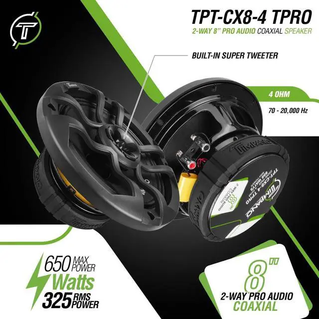 Listen to music to a whole new level with a PAIR of TPT-CX8-4 PRO, a 8 2-Way Coaxial, that is basically a PRO Audio full-range loudspeaker combo. This pro midbass speaker has an impressive punch combined with its bullet tweeter. It responds from 70 to 20, 000 Hz and gives your system a new quality of sound. 125 Hz under 325 Watts of Amplifier RMS Power with 18dB Slope120 Hz under *250 Watts of Amplifier RMS Power with 12dB Slope (*Maximum power handling using a regular car audio amplifier crossover)
