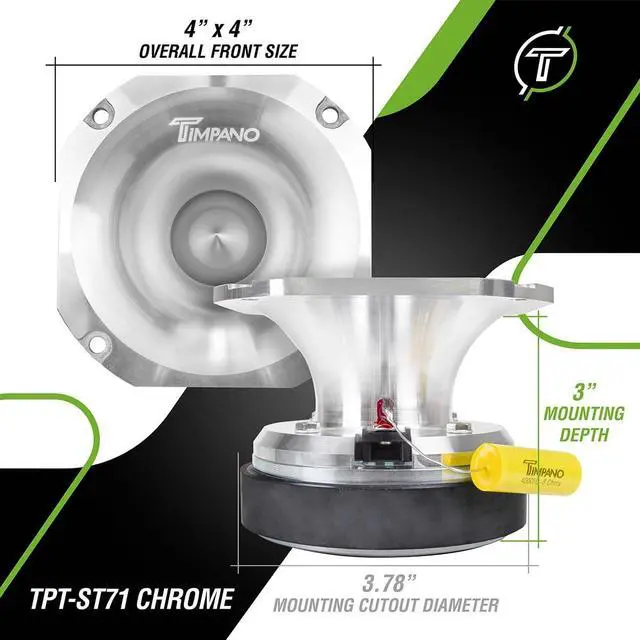 TIMPANO TWEETERS - High-performance Timpano TPT-ST71 CHROME 4 PRO Audio Super Tweeters for Car audio systems, capable of providing concert-like sound with 900 watts max power per pair and 8 Ohm impedance. ^^ SUPER TWEETER - Equipped with titanium diaphragm and 1.5" voice coil, these tweeters can handle 300 watts RMS and offer a sensitivity of 108 dB, reproducing the brightest and crispest sound with a frequency response of 4, 000 20, 000Hz. ^^ BULLET TWEETERS - Built-in crossover capacitors attenuate low-end frequencies to prevent damage, and the high-pass filter recommended on TPT-SP4BT DSP ensures optimal performance based on power per tweeter.