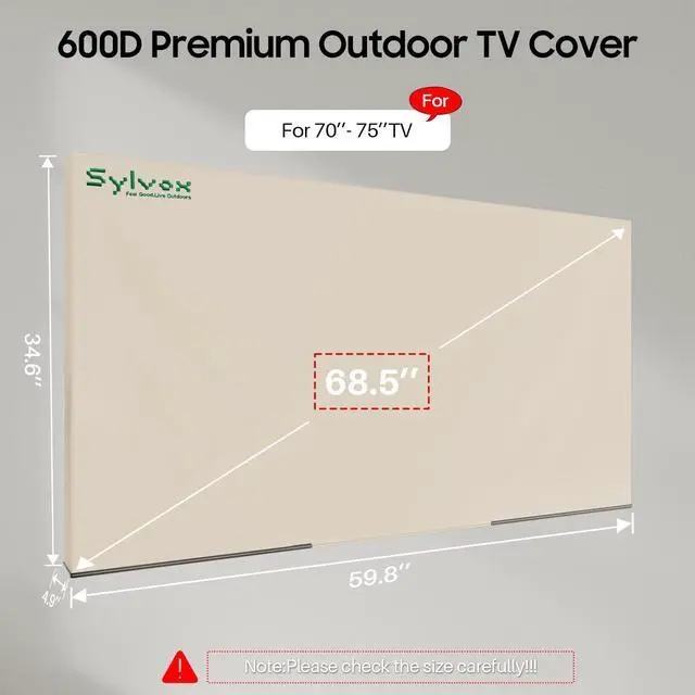 Size Dimension: This outdoor TV cover measures 59.8"W x 34.6"H x 4.9"D, and is compatible with most TV models between 70" to 75". Please be sure to measure your TV first to determine the suitable outdoor tv cover size. ^^ Premium 600D