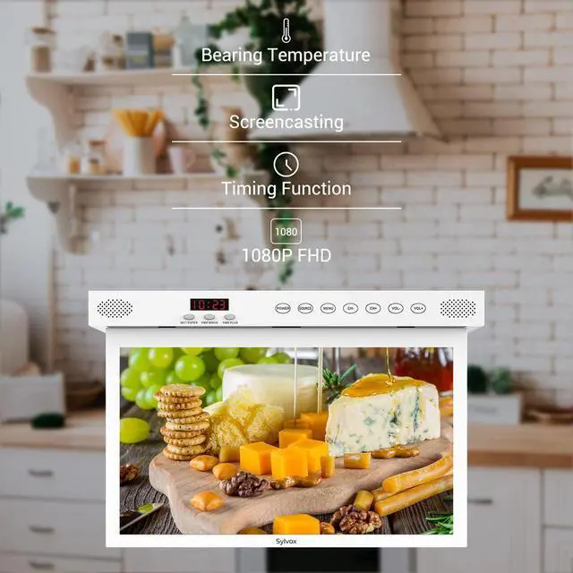 It can also be easily installed inside a cabinet or under the roof, saving valuable counter space. ^^ Easy setupFlap-down kitchen TV installation requires only a few screws and a screwdriver and less time than it takes to brew a cup of coffee. No need to worry about complicated installation instructions or difficult wiring. ^^ More FunctionWith a clock function and timer alarm clock, you can keep track of time while preparing your favorite dishes. The waterproof touch key ensures ease of use, while Bluetooth 5.0 and 2.4 +5G full-band WiFi connectivity provide endless entertainment options.