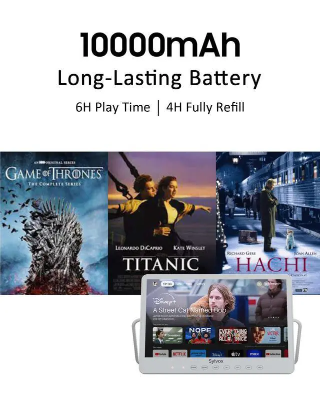 ^^ Marathon Battery Life: Equipped with a 10, 000mAh battery, this portable TV offers 4.5 -6 hours of continuous viewingideal for two full-length movies. Recharges fully in just 4 hours.