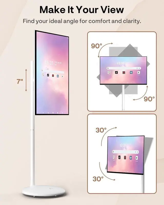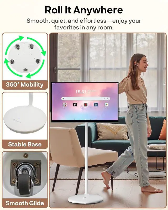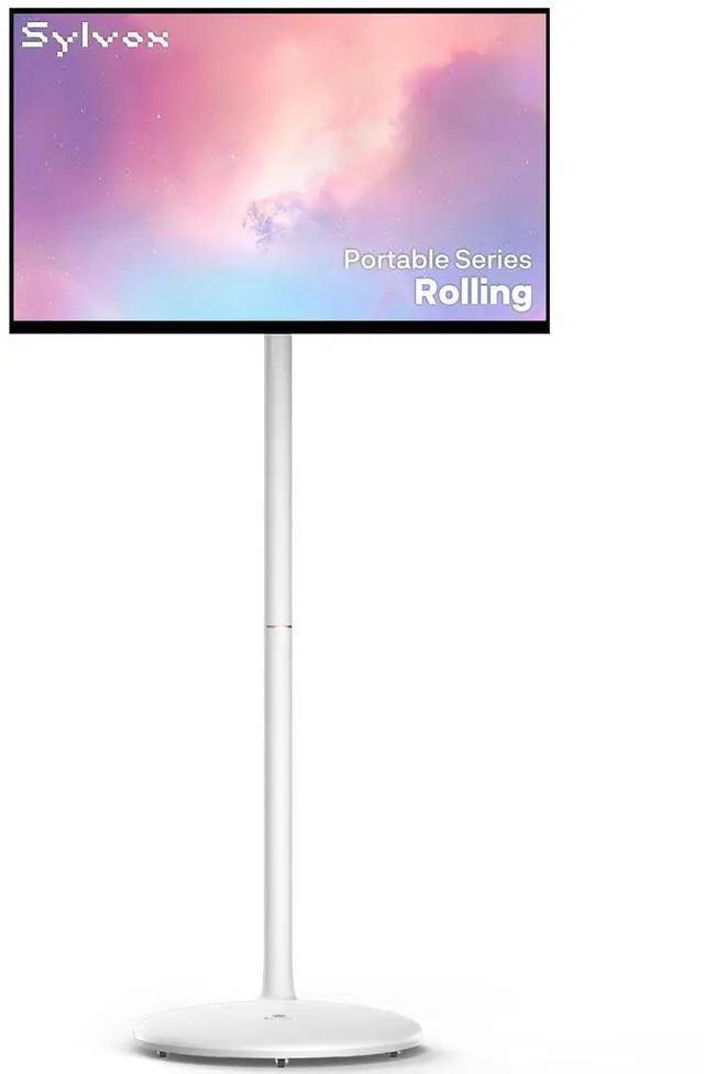 Anywhere: This portable TV on wheels is made to moveeasily with one hand. Enjoy 45 hours of cord-free use with a 10, 000mAh battery. For better viewing comfort, the stand easily tilts, pivots, lifts, and moves smoothly. Perfect for watching in bedrooms, kitchens, or even beside your workout mat. ^^ Looks Vivid, Sounds