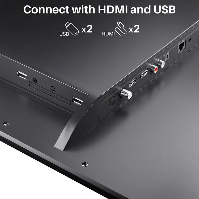 ^^ Frameless Design: Frame-less design and metal base make this 12-volt TV look sleeker and more minimalist. It can be wall mounted or placed on a tabletop, available VESA pattern 100x100 mm. This RV TV has 2xHDMI and 2xUSB ports to connect more external devices, and it can also be used as a monitor.