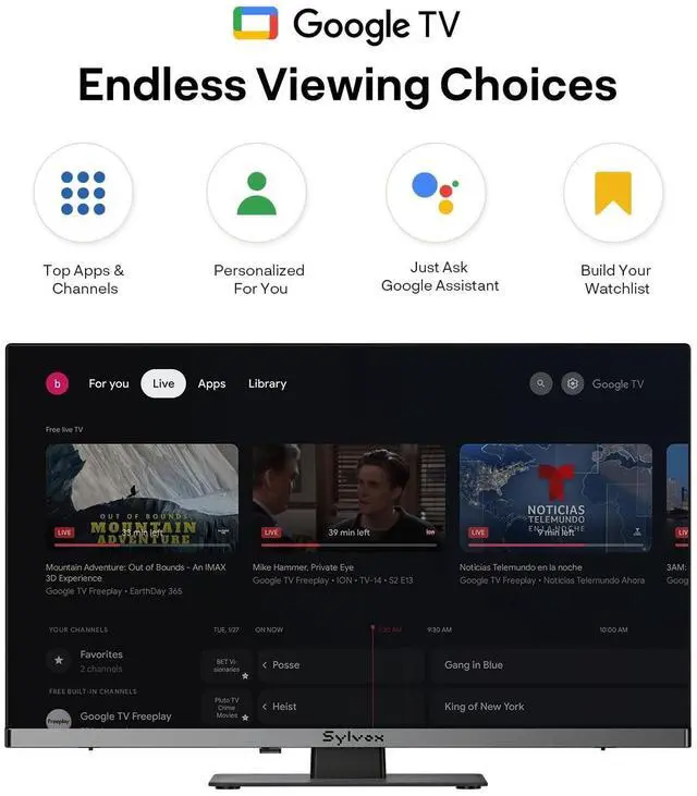 Smart 12V TVSYLVOX Smart RV TV with APP Store organizes your favorite content all in one place. Realize full entertainment in your moving life. Upgrade your RV TV to Google OS smart TV. ^^ Built-in DVD PlayerThis TV DVD combo lets you enjoy DVDs seamlessly without an extra player. With Hi-Fi soundbox speakers, immerse yourself in cinematic-quality audio and visuals for a truly engaging entertainment experience. ^^ 1080P Small TVThe Sylvox 24" RV TV delivers stunning 1080P resolution with over a billion accurate colors for natural, precise picture quality. Enjoy smooth visuals with a 60Hz refresh rate and a 178 wide viewing angle, perfect for watching your favorite shows on the go.