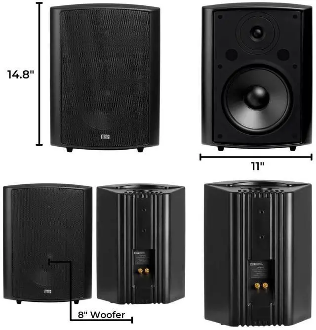 All-weather design withstands even harsh climates ^^ Mounting bracket is designed to mount either vertically or horizontally ^^ Gold-plated spring compression binding posts for optimum connectivity ^^ Sturdy ABS polymer frame ^^ Power-coated rust-resistant Aluminum grille