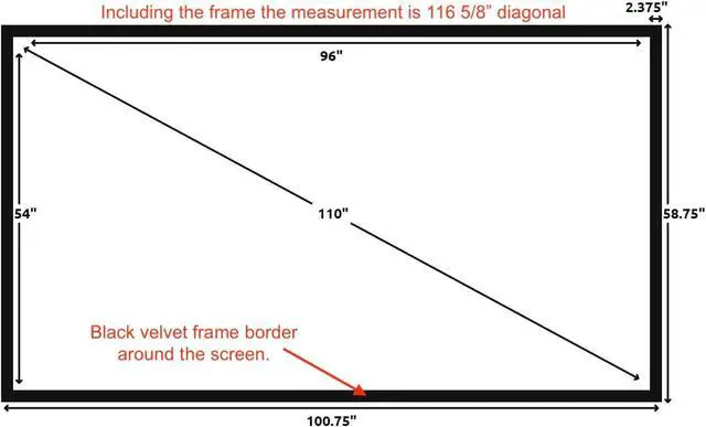Wall Mounted Fixed Frame Projection Screen (Overall Size 58.75" Tall x 100.75" Wide) (Viewing Area 110" Diagonal x 54" Tall x 96" Wide) No option for Legs or Stands with this product. Recommended for projectors with Native 16:9 Resolution ^^ Shade of the material is light grey & 1.0 gain. Material may appear white because of the special reflective properties. Compare with white paper to see the shade of Grey. Works great with Long, Short and Ultra Short Throw projectors. ^^ 2 3/8" heavy duty beveled aluminum frame wrapped in light-absorbing black velvet material for a beautifully crisp viewing image; Enjoy beautiful movies, pictures, and games in FULL HD, 4K / 8K and Active 3D ^^ Quick and easy assembly with tensioning rod system ensures that you can bring cinema-quality entertainment to your home in just a few minutes.