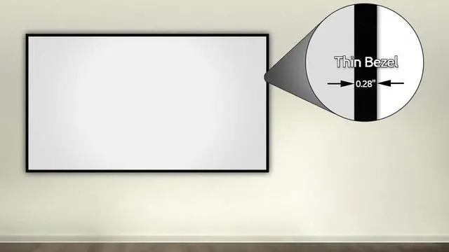 Wall Mounted Fixed Frame Projection Screen (Overall Size 63.38" Tall x 112.25" Wide) (Viewing Area 128" Diagonal x 62.875" Tall x 111.625" Wide) No option for Legs or Stands with this product. Recommended for projectors with Native 16:9 Resolution ^^ Shade of the material is light grey & 1.0 gain. Material may appear white because of the special reflective properties. Compare with white paper to see the shade of Grey. Works great with Long, Short and Ultra Short Throw projectors. Recommended for darker rooms with light colored walls. ^^ 0.28" (7mm) Thin Bezel Projection Screen Perfect for UST Projectors.