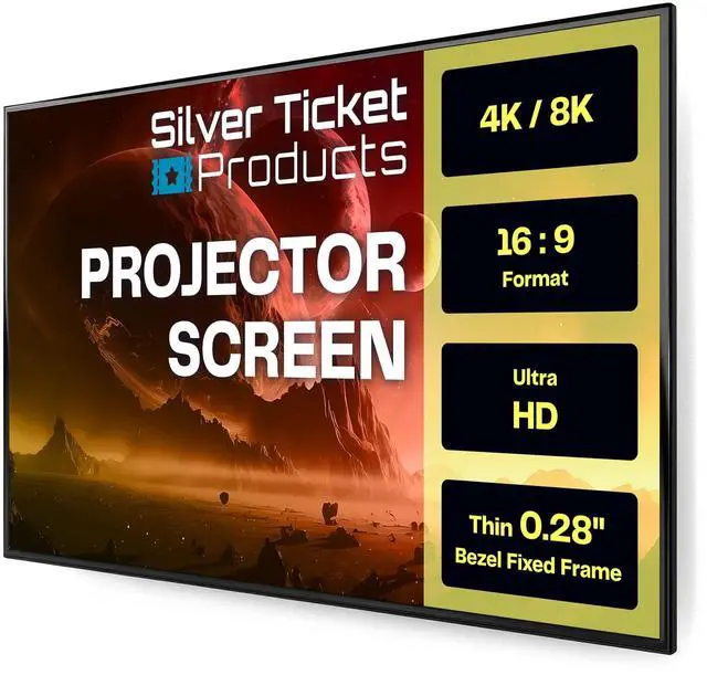 Wall Mounted Fixed Frame Projection Screen (Overall Size 49.63" Tall x 87.75" Wide) (Viewing Area 100" Diagonal x 49" Tall x 87.125" Wide) No option for Legs or Stands with this product. Recommended for projectors with Native 16:9 Resolution ^^ Acoustically Transparent (Speakers may be placed behind the screen surface) 1.15 Gain White screen surface with an exceptionally wide viewing angle at 160 degrees with no resolution loss at any viewing angle. Works great with Long, Short and Ultra Short Throw projectors. Recommended for dark dedicated theater rooms. ^^ 0.28" (7mm) Thin Bezel Projection Screen Perfect for UST Projectors.