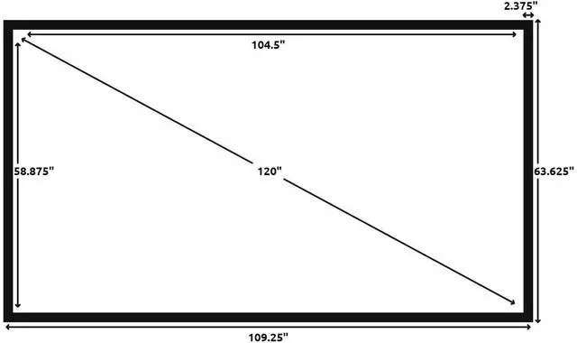 Wall Mounted Fixed Frame Projection Screen (Overall Size 63.625" Tall x 109.25" Wide) (Viewing Area 120" Diagonal x 58.875" Tall x 104.5" Wide) No option for Legs or Stands with this product. Recommended for projectors with Native 16:9 Resolution ^^ 0.95 Gain Dark Grey screen surface with an exceptionally wide viewing angle at 160 degrees with no resolution loss at any viewing angle. Works great with Long Throw projectors, Not Recommended Short and Ultra Short Throw projectors. ^^ 2 3/8" heavy duty beveled aluminum frame wrapped in light-absorbing black velvet material for a beautifully crisp viewing image; Enjoy beautiful movies, pictures, and games in FULL HD, 4K / 8K and Active 3D ^^ Quick and easy assembly with tensioning rod system ensures that you can bring cinema-quality entertainment to your home in just a few minutes.
