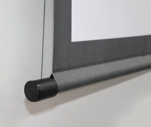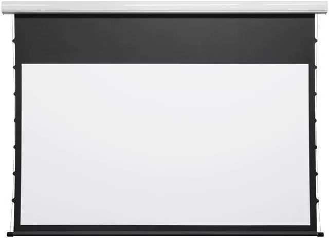 Works great with Long and Short Throw projectors. The standard white material is not acoustically transparent. Not an ALR screen. Recommended for dark rooms. ^^ Heavy duty aluminum case. Mounting brackets can be placed along the extruded aluminum case to align with the studs or joists in your walls for a secure and quick installation. Wall & Ceiling Mount, or Hang by Cable. Black printed borders surround the viewing area for a crisp image. Adjustable black drop with a max black drop of 15". Enjoy beautiful movies, pictures, and games in FULL HD, 4K / 8K and Active 3D ^^ Before purchasing this screen, purchase the projector and project an image on wall to determine the size works for the projector.