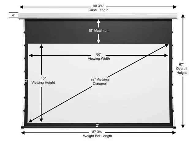 Tensioned 110 Volt Motorized Roll Down Projection Screen. (Overall Size 67" Tall x 90 3/4" Wide) (Viewing Area 92" Diagonal x 45" Tall x 80" Wide) Recommended for projectors with Native 16:9 Resolution. See the product dimensions in the images. Tension is adjustable. ^^ 1.0 Gain White screen surface with an exceptionally wide viewing angle at 160 degrees with no resolution loss at any viewing angle. Works great with Long, Short and Ultra Short Throw projectors. The standard white material is not acoustically transparent. 1.0 Gain White screen surface with an exceptionally wide viewing angle at 160 degrees with no resolution loss at any viewing angle.